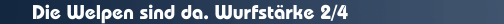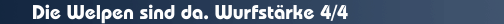 Die Wurfstärke ist 2/4. Ein Rüde ist schwarz-gelb, der andere Rüde und alle Hündinnen sind dunkel grau.